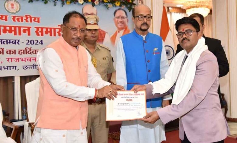 राज्यपाल श्री रमेन डेका और मुख्यमंत्री श्री विष्णु देव साय ने आज शिक्षक दिवस के अवसर पर राजभवन गरिमामयी समारोह में वर्ष 2023-24 के उत्कृष्ट शिक्षकों को राज्य स्तरीय सम्मान प्रदान किया। राज्यपाल श्री डेका ने कहा शिक्षक विद्यार्थियों को बड़ा सपना देखने प्रेरित और पूरा करने प्रोत्साहित करें। उन्होंने कहा कि शिक्षक विद्यार्थियों को शिक्षा के साथ नैतिक मूल्यों की भी शिक्षा देना सुनिश्चित करें।